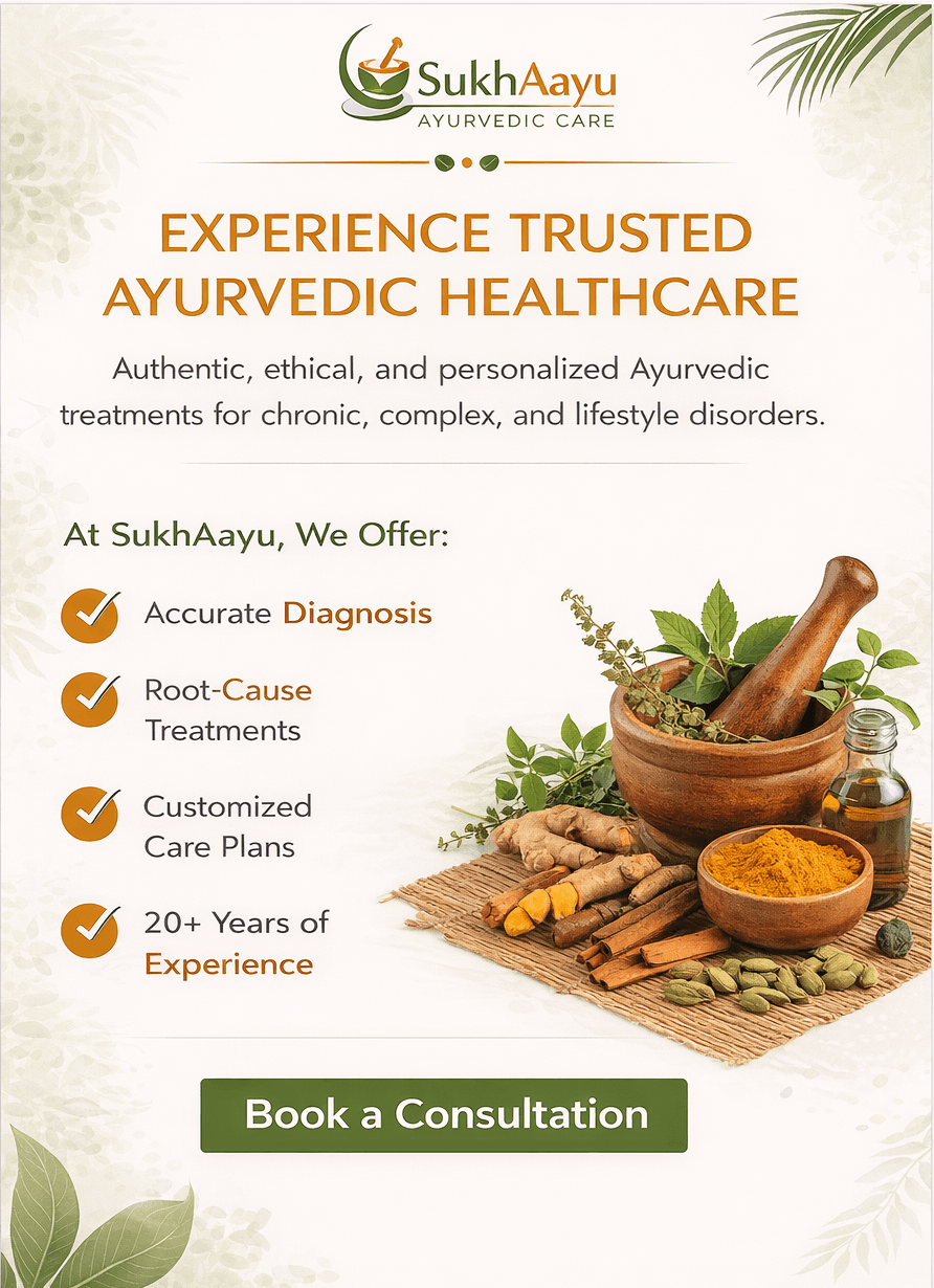 SukhAayu Ayurvedic Care is dedicated to providing authentic, ethical, and result-oriented Ayurvedic healthcare in a modern and patient-friendly environment. Our philosophy is rooted in the belief that true healing begins with understanding the body deeply, not just managing visible symptoms. Every patient who visits SukhAayu receives careful attention, detailed evaluation, and a treatment approach designed specifically for their unique health needs.